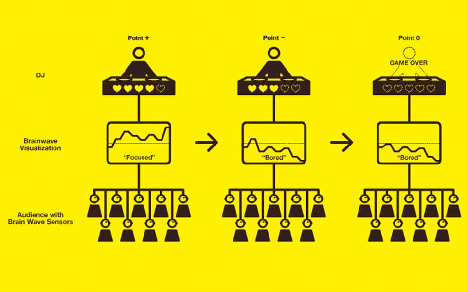 Teamed up with Qosmo, developed “Brain Disco”, where DJ must maintain audiences’ “attention”, measured with brainwave sensors, in order to keep DJing. If the average attention value remains less than a given threshold, DJ gets kicked out.